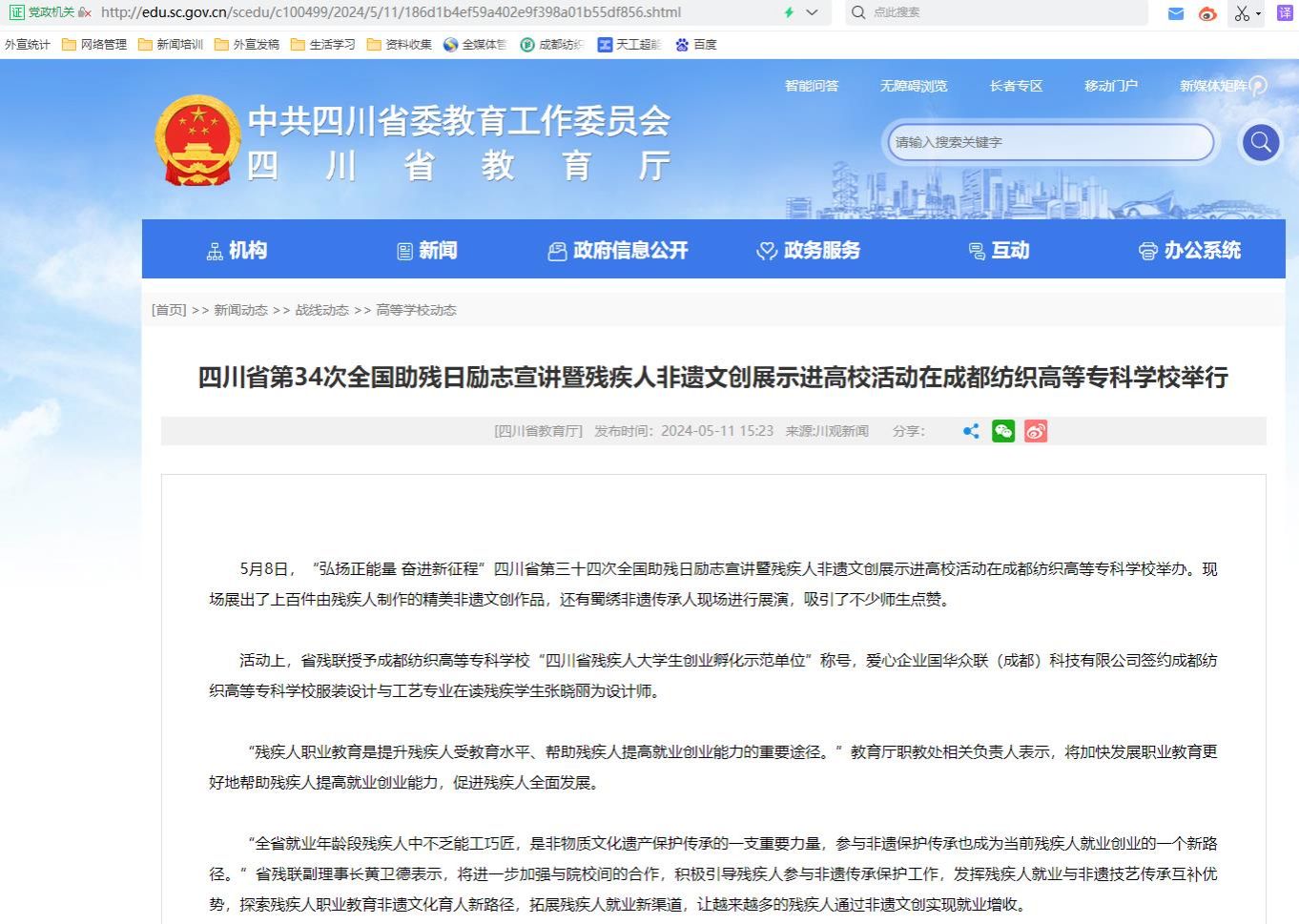5月8日,“弘扬正能量 奋进新征程”四川省第三十四次全国助残日励志宣讲暨残疾人非遗文创展示进高校活动在pg电子官方网站举办。现场展出了上百件由残疾人制作的精美非遗文创作品,还有蜀绣非遗传承人现场进行展演,吸引了不少师生点赞。