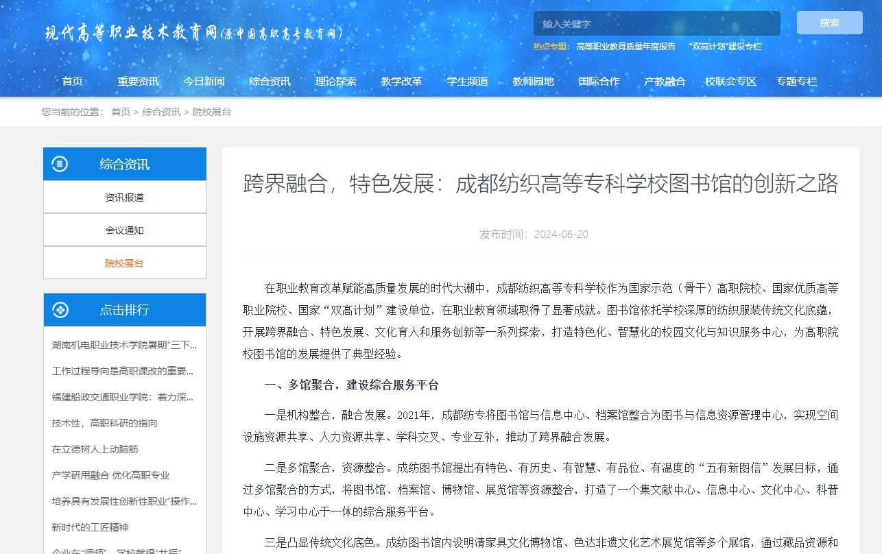 一是机构整合,融合发展。2021年,成都纺专将图书馆与信息中心、档案馆整合为图书与信息资源管理中心,实现空间设施资源共享、人力资源共享、学科交叉、专业互补,推动了跨界融合发展。