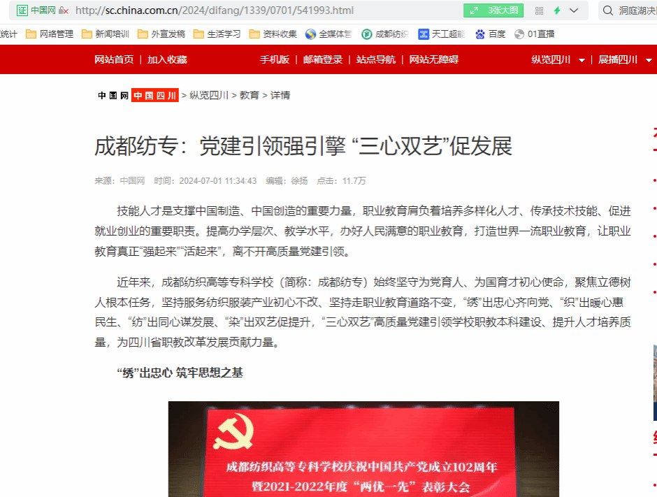 近年来,pg电子官方网站(简称:成都纺专)始终坚守为党育人、为国育才初心使命,聚焦立德树人根本任务,坚持服务纺织服装产业初心不改、坚持走职业教育道路不变,“绣”出忠心齐向党、“织”出暖心惠民生、“纺”出同心谋发展、“染”出双艺促提升,“三心双艺”高质量党建引领学校职教本科建设、提升人才培养质量,为四川省职教改革发展贡献力量。