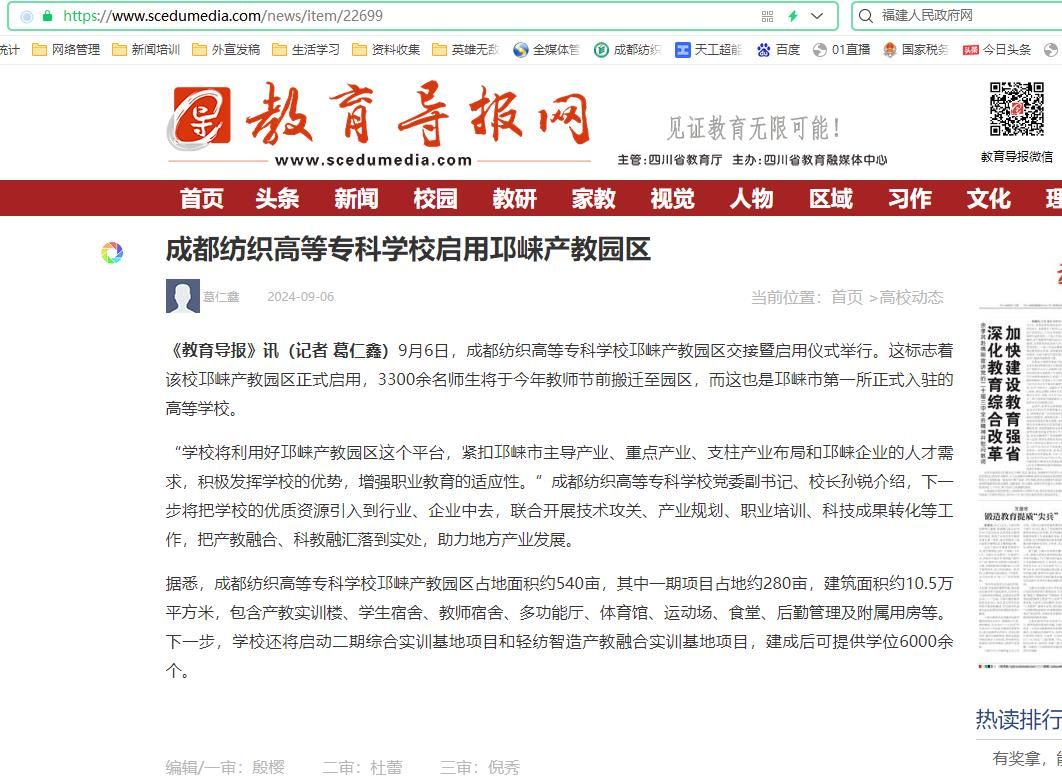 《教育导报》讯(记者 葛仁鑫)9月6日,pg电子官方网站邛崃产教园区交接暨启用仪式举行。这标志着该校邛崃产教园区正式启用,3300余名师生将于今年教师节前搬迁至园区,而这也是邛崃市第一所正式入驻的高等学校。