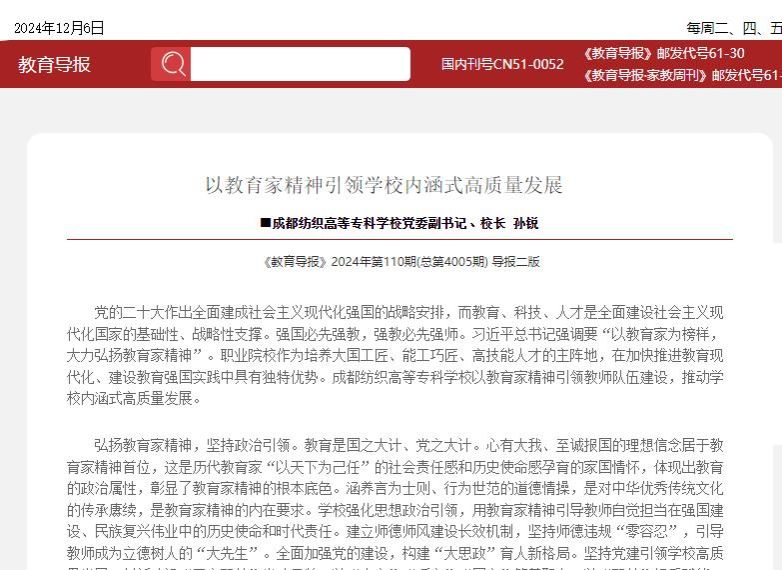 弘扬教育家精神,锻造大国良师。教育家精神的道德引领和工匠精神的技能追求是职业教育教师的双重品质。教育家是知识的生产者和传授者,必须具备扎实的专业知识,掌握专门的教育教学技能,要具备启智润心、因材施教的育人智慧。勤学笃行、求是创新的躬耕态度,要求教师要具备终身学习的能力,要有创新探索的精神。学校以教育家精神为引领,围绕国家重大发展战略和四川产业发展规划,精准谋划打造各类人才集聚平台,持续建设“教学名家、科技专家、管理行家”三支队伍,努力培养一批具有“能吃苦、技艺精、善创造”成纺特质的高素质技术技能人才。近年来,学校成功培育全国高校黄大年式教师团队1个、国家“万人计划”教学名师1人、国务院政府特殊津贴获得者2人、全国模范教师1人、黄炎培职业教育奖杰出教师1人、四川省“最美教师”1人、四川省“四有”好老师2人、四川省优秀教师1人等,为学校高质量发展奠定坚实的人才基础。