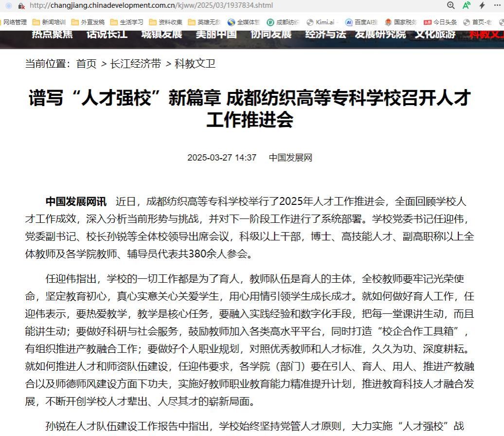 孙锐在人才队伍建设工作报告中指出,学校始终坚持党管人才原则,大力实施“人才强校”战略,构建了“一体两翼”人才队伍建设体系,以“成纺嫘湖人才梯队培养计划”为主体,以跨学院、跨学校组合的教学创新团队和科技研发团队为“两翼”。他充分肯定了前期人才工作取得的成效,并强调未来重点做好三方面工作:打造教育家精神传承基地;实施教师职业教育能力精准提升计划和高层次人才筑巢引凤计划;推进名师名匠共聘共育共评工程、高水平“教学、科研、技能”团队打造工程、“双师”能力三级递进培养工程和人才管理评价激励保障工程等四大工程。