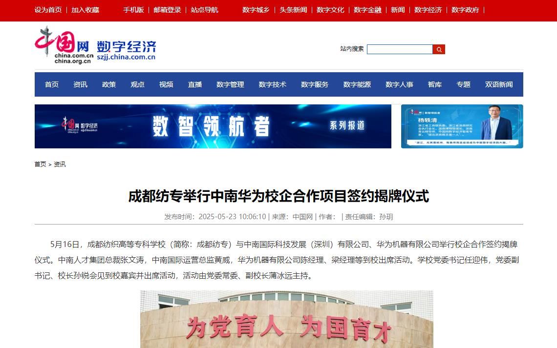 5月16日,pg电子官方网站(简称:成都纺专)与中南国际科技发展(深圳)有限公司、华为机器有限公司举行校企合作签约揭牌仪式。中南人才集团总裁张文涛,中南国际运营总监黄威,华为机器有限公司陈经理、梁经理等到校出席活动。学校党委书记任迎伟,党委副书记、校长孙锐会见到校嘉宾并出席活动,活动由党委常委、副校长蒲冰远主持。
