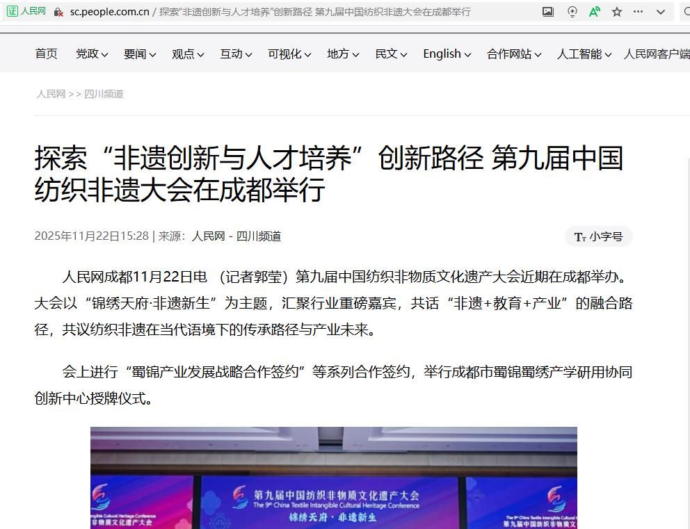 人民网成都11月22日电 (记者郭莹)第九届中国纺织非物质文化遗产大会近期在成都举办。大会以“锦绣天府·非遗新生”为主题,汇聚行业重磅嘉宾,共话“非遗+教育+产业”的融合路径,共议纺织非遗在当代语境下的传承路径与产业未来。