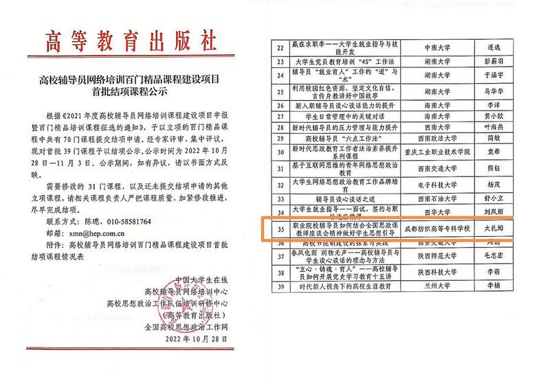 2021年10月,在太扎姆书记的牵头组织下,服装学院以《职业院校辅导员如何结合全国思政课教师座谈会精神做好学生思想引导》为题,积极申报了中国大学生在线、高校辅导员网络培训中心、高校思想政治工作队伍培训研修中心(高等教育出版社)、全国高校思想政治工作网联合开展的“高校辅导员网络培训课程建设暨百门精品培训课程征选”项目,同年11月接到立项通知。