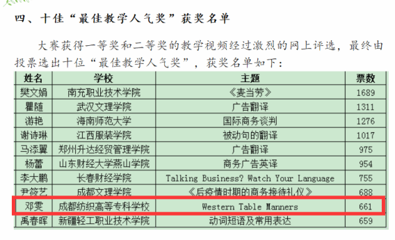 近日,“第二届BETT全国商务英语翻译教师金课大赛”比赛结果揭晓,pg电子外语与文化旅游学院教师邓雯喜获专科组全国二等奖和十佳“最佳教学人气奖。