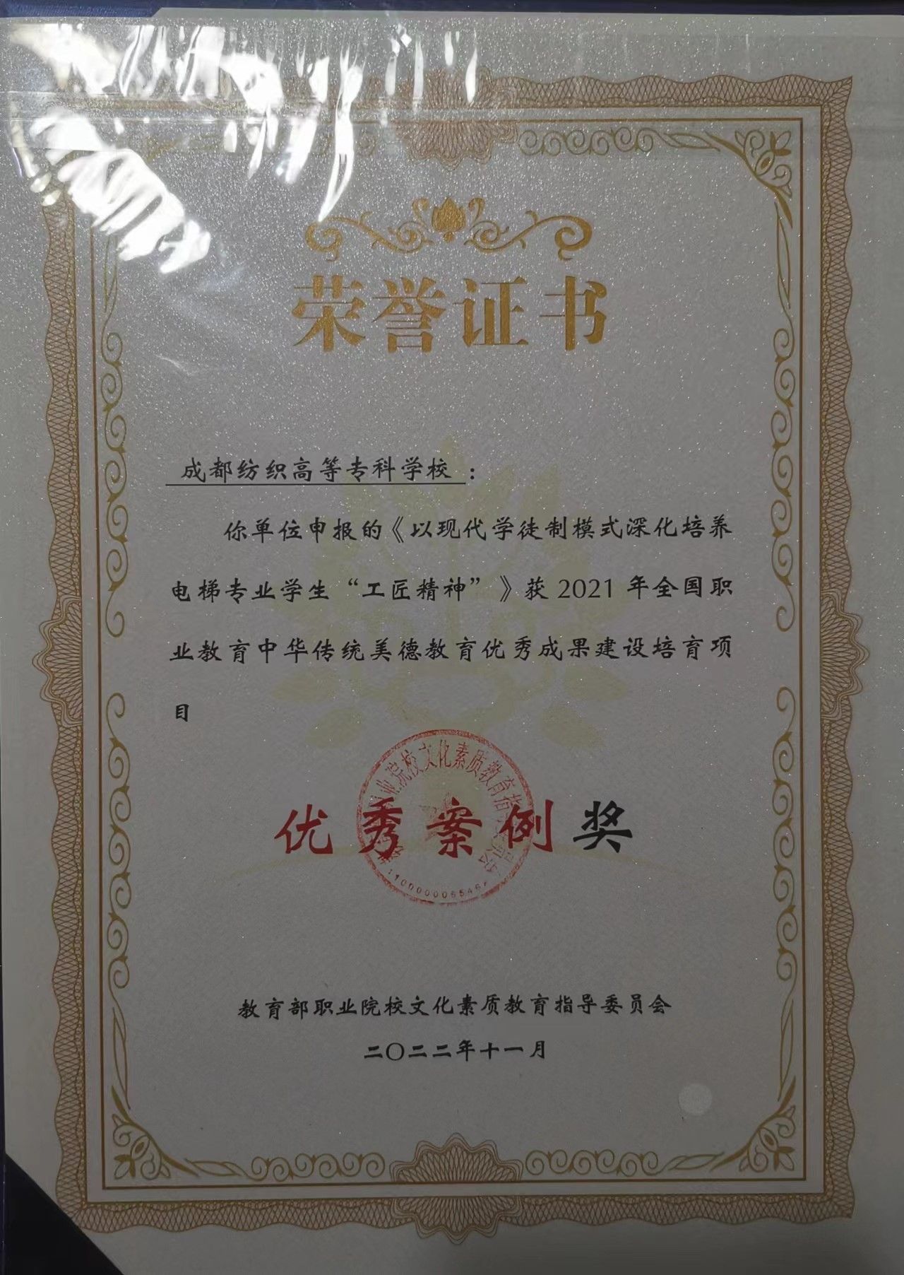 近日,教育部职业院校文化素质教育指导委员会公布2021年全国职业教育中华传统美德教育优秀成果建设培育项目评比结果,pg电子智能智造与装备学院“大师带双师,双师出高徒,以现代学徒制模式深化培养电梯专业学生工匠精神”案例获得全国职业教育中华传统美德教育优秀成果建设培育项目“优秀案例奖”。