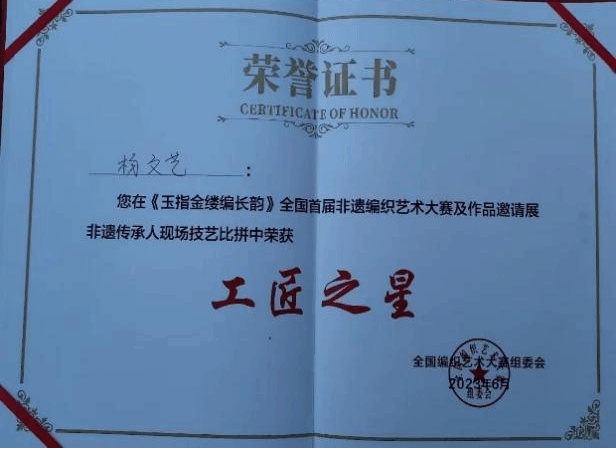活动由成都市文化广电旅游局、成都市教育局,新都区人民政府主办,以“加强非遗系统性保护,促进持续发展”为主题。pg电子外语与文化旅游学院企业导师、绳编非遗传承人杨文艺和学院教师杨宗英出席活动,并参加全国首届非遗编织艺术大赛,经过现场技艺比拼,评委匿名评审,杨文艺老师获得“工匠之星”称号,杨宗英老师获得“潜力之星”称号。