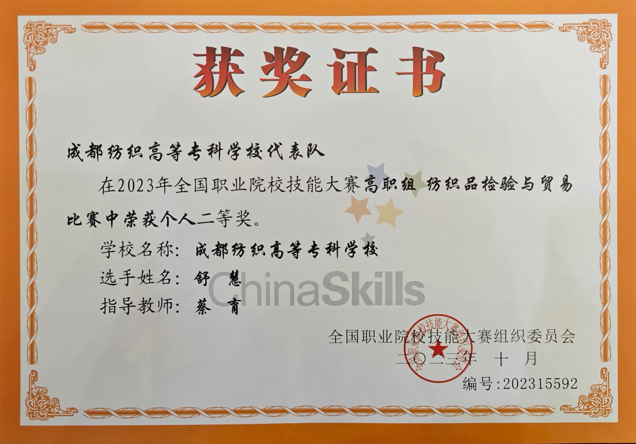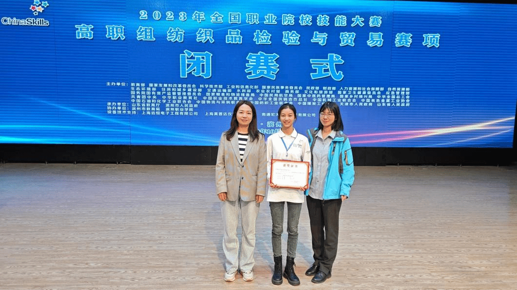 10月18日—20日,2023年教育部全国职业院校技能大赛(高职组)纺织品检验与贸易赛项在山东滨州职业学院举行,pg电子代表四川省参赛。经过激烈角逐,纺织工程学院学生舒慧从全国42个参赛院校中脱颖而出,荣获二等奖。