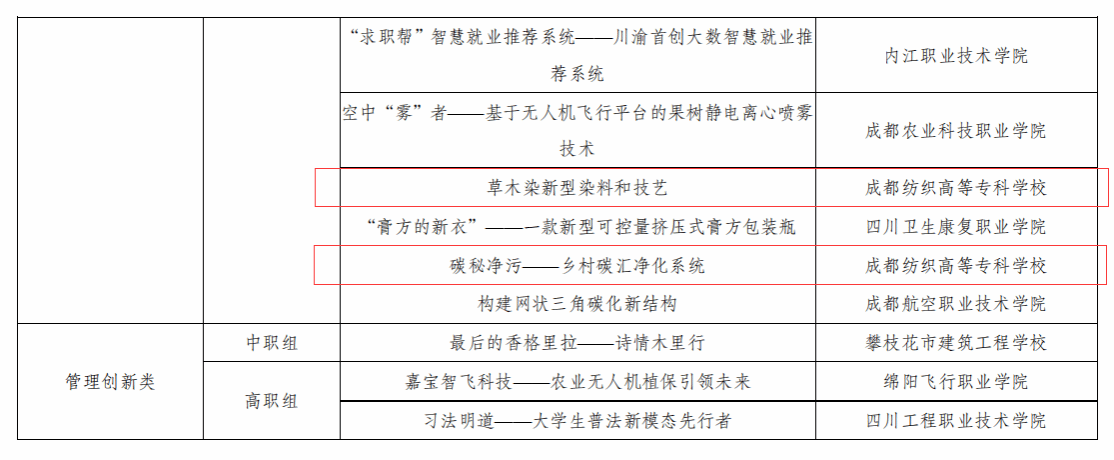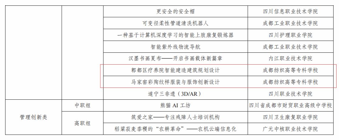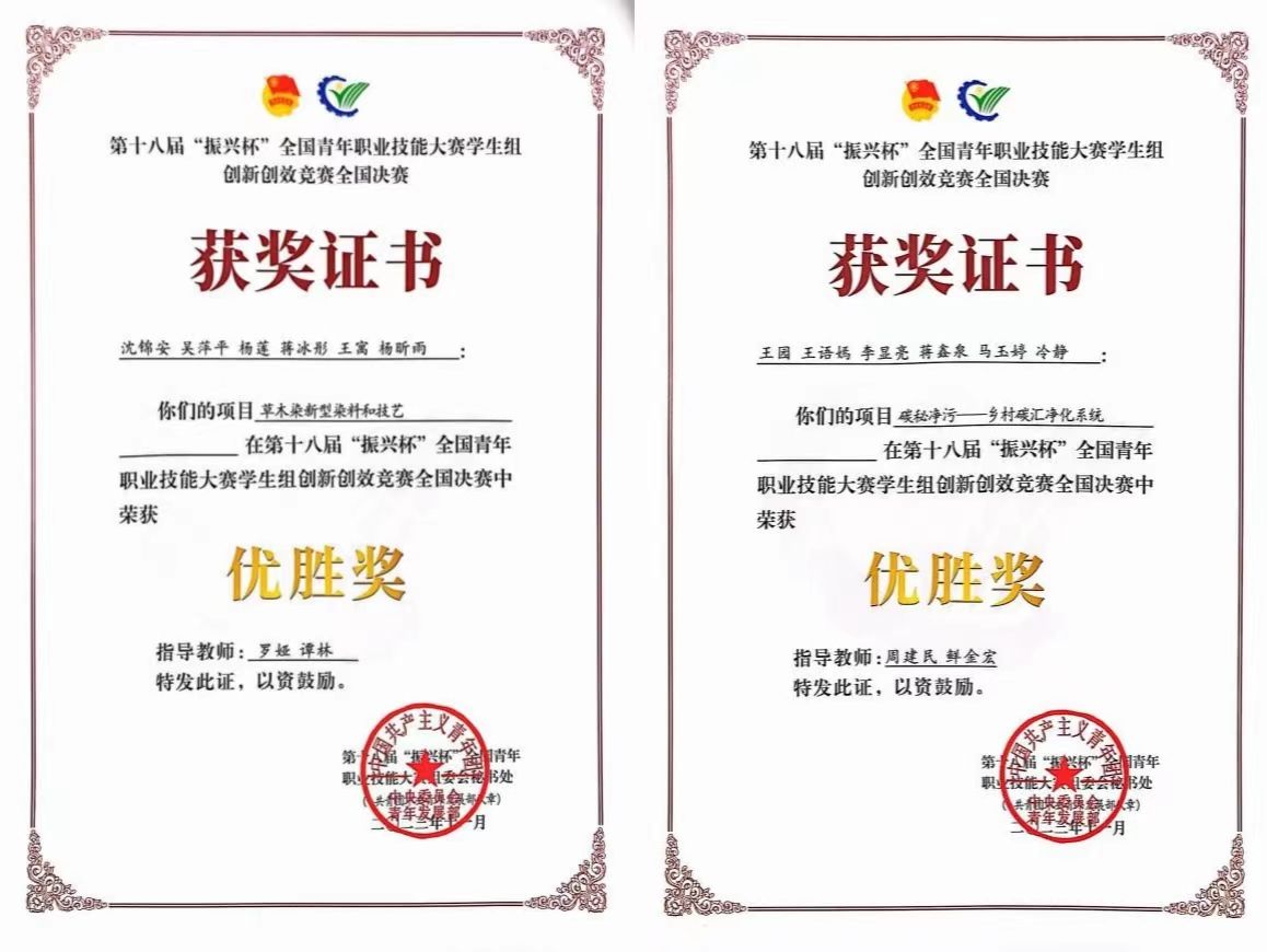 大赛由共青团中央、人力资源社会保障部主办,以“踔厉奋发启新程,挺膺担当建新功”为主题,设置主体赛(职业技能竞赛)、专项赛(创新创效竞赛)两项赛事。pg电子报送的《草木染新型染料和技艺》《碳秘净污——乡村碳汇净化系统》2个项目获得“四川技能大赛——2023年四川省青年职业技能大赛创新创效竞赛”银奖并进入国赛获得优胜奖;《郫都区疗养院智能建造建筑规划设计》《马家窑彩陶纹样服装与服饰创新设计》2个项目获得铜奖;《手作产品新型针法融合技艺》《艺遗·秀》等8个项目获得优秀奖。