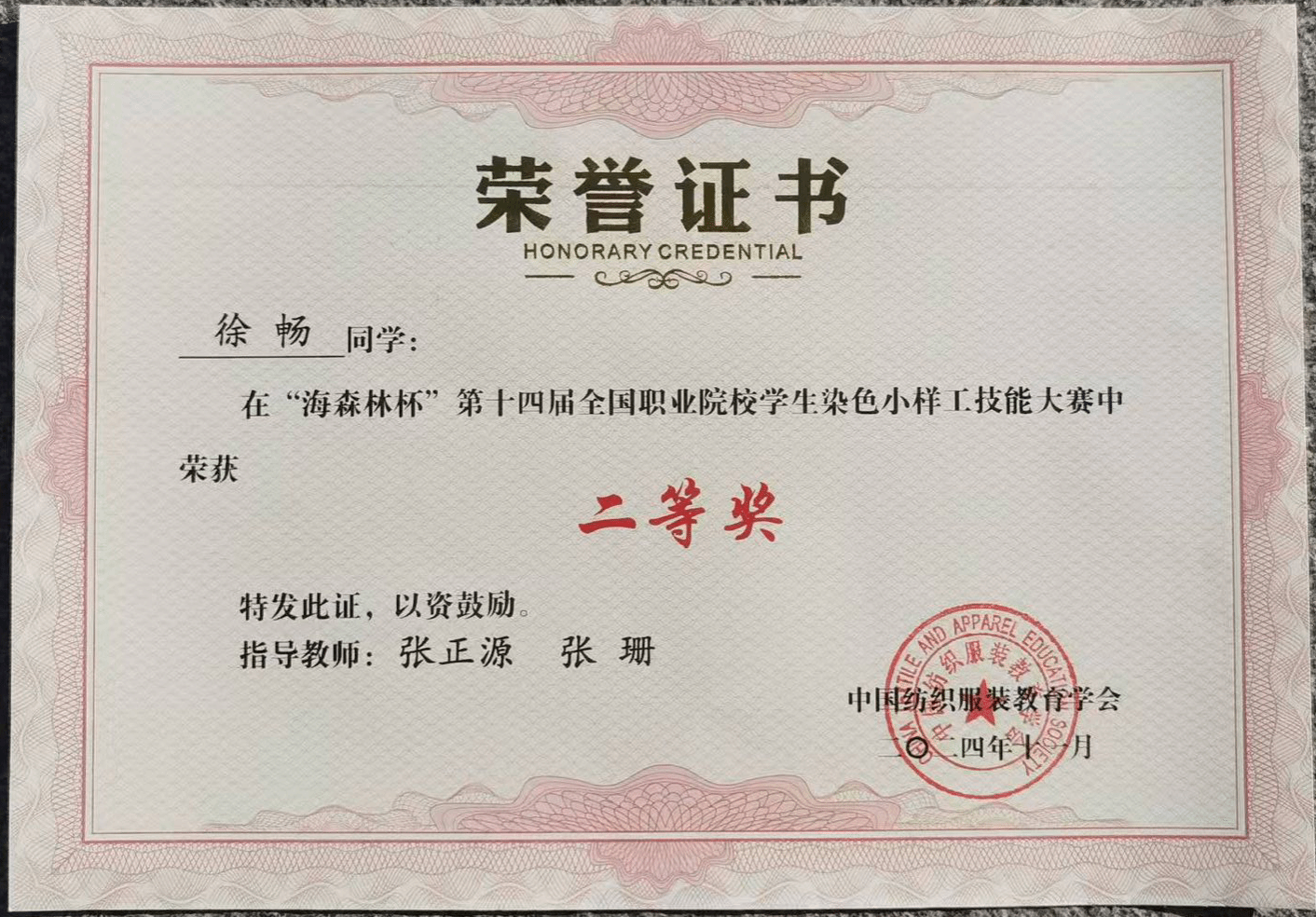 大赛由中国纺织服装教育学会主办、山东轻工职业学院承办,共设立理论知识与实际操作两个竞赛环节。理论知识环节主要考查选手的专业知识储备;实际操作环节,要求选手随机抽取两块不同颜色的布样,自主设计染料配方,按照规范操作全流程进行仿色,最后通过仪器客观评价仿样面料与原样的色差吻合度。经过激烈角逐,pg电子参赛学生徐畅获二等奖,项境灵、夏露露分获三等奖,周传弘、田鑫媛、向晓琴分获优秀奖,为轻材学院争光,也为学校赢得了荣誉。