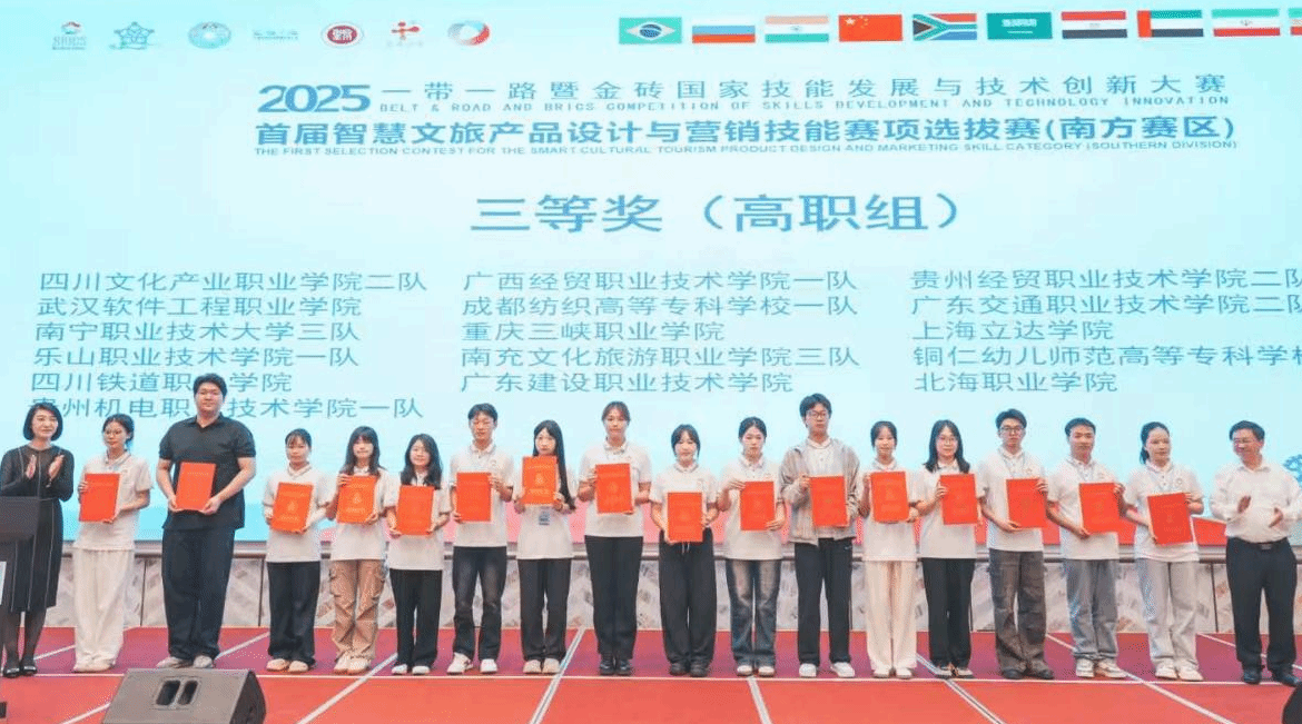 10月13日-5日,2025年一带一路暨金砖国家技能发展与技术创新大赛首届智慧文旅产品设计与营销技能赛项(南方赛区)在重庆旅游职业学院举办。由文旅学院许梦雪和张智老师指导的学生团队经过激励的角逐,荣获南方赛区三等奖,将于11月参加2025年一带一路暨金砖国家技能发展与技术创新大赛首届智慧文旅产品设计与营销技能赛项南北方全国总决赛。