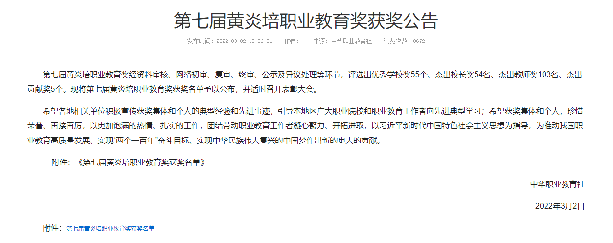 3月2日,中华职业教育社发布公告,公布了《第七届黄炎培职业教育奖获奖名单》。pg电子阳川教授喜获“杰出教师奖”。这是pg电子教师第三次获得该奖项。