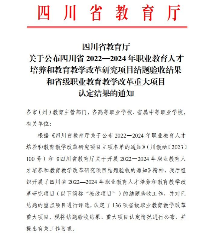 根据《四川省教育厅关于公布四川省 2022—2024 年职业教育人才培养和教育教学改革研究项目结题验收结果和省级职业教育教学改革重大项目认定结果的通知》,学校《适应制造产业智能化升级的现场工程师人才培养模式研究》等28个项目全部通过教育厅复核验收,《大思政视域下高职院校课程思政育人体系的构建与实践》等 3 个项目被认定为省级职业教育教学改革重大项目,具体名单如下。