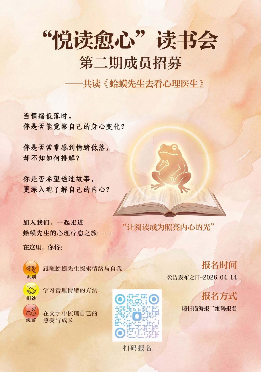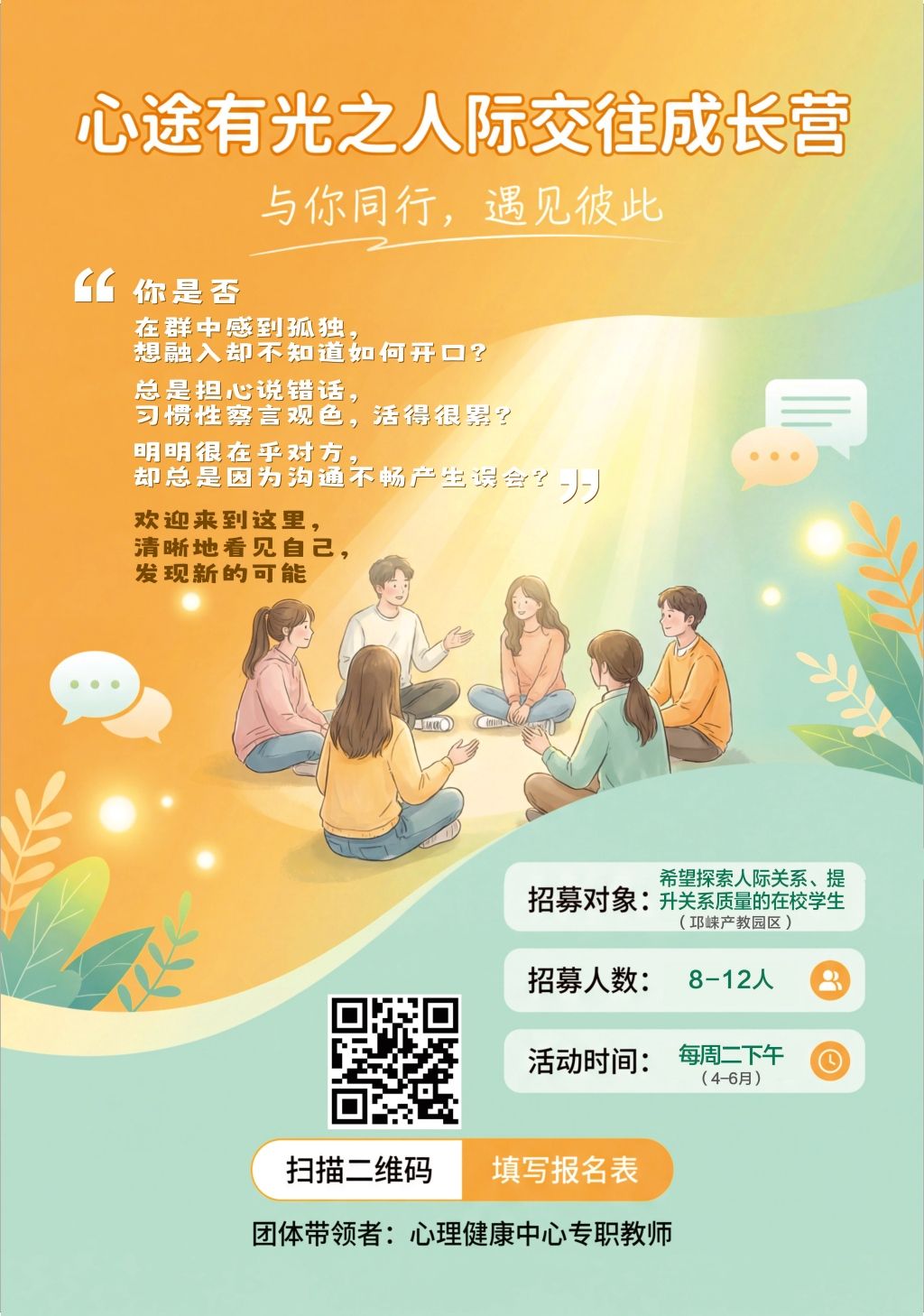 为帮助同学们更好地觉察自我、舒缓压力、提升人际交往能力,心理健康中心将于4月至6月推出三项团体辅导活动,欢迎同学们按校区报名参加。