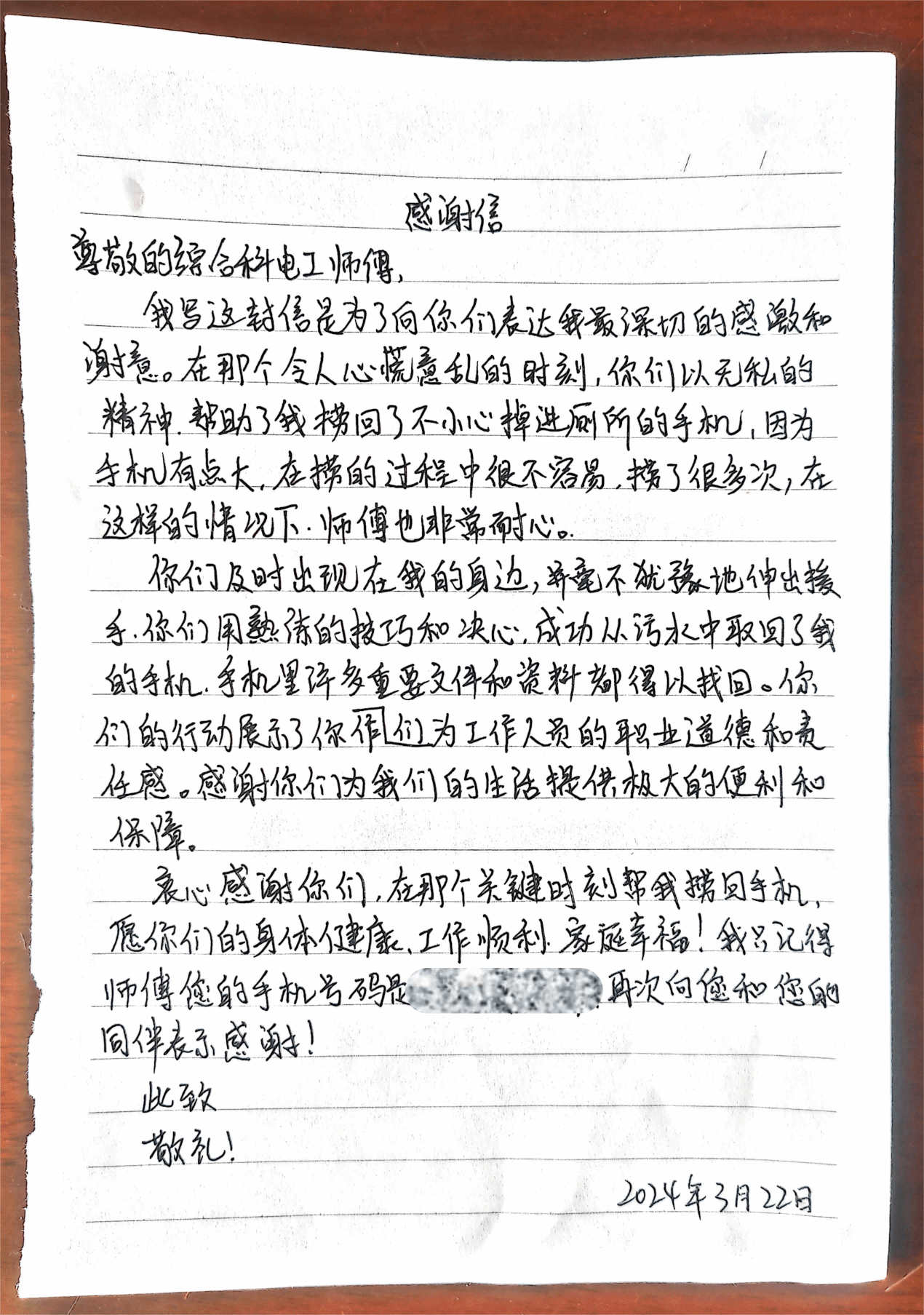 据了解,写信的学生不小心将手机掉进厕所内,在手足无措之时,拨通了综合保障科的电话,电工师傅王德康在得知情况后赶到现场。由于厕所下水管壁较窄较长,手机又比较宽,打捞过程十分不易,经过几番努力,才从又臭又脏的污水里将手机捞起,捞起时手机上全是污物……王德康不畏脏臭,没有半点犹豫,用自己熟练的技巧和坚定的决心,帮学生解决燃眉之急。学生还没来得及询问师傅姓名,王德康便匆匆离开,但是这件事深深触动了学生的心灵,于是写了感谢信,第二天便交到了保障处办公室,以表达对师傅的感激之情。