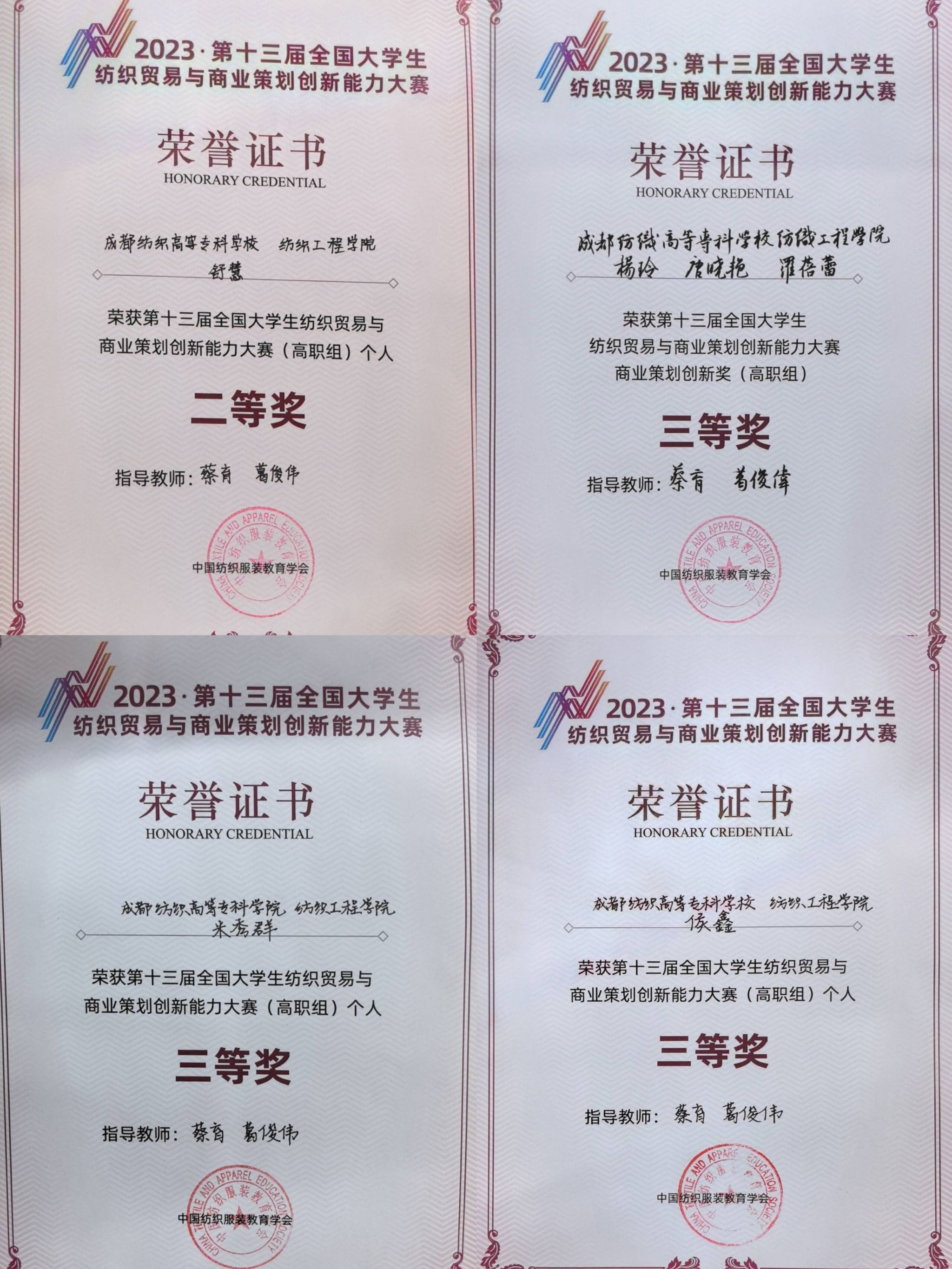 由中国纺织服装教育学会主办,中国纺织服装电商人才培养基地及上海远恒电子工程有限公司联合协办的“全国大学生纺织贸易与商业策划创新能力大赛”于12月1日至3日在上海东华大学举行。pg电子纺织工程学院表现优异,获得个人二等奖1个、三等奖2个,以及商业策划创新奖(高职组)三等奖的佳绩。