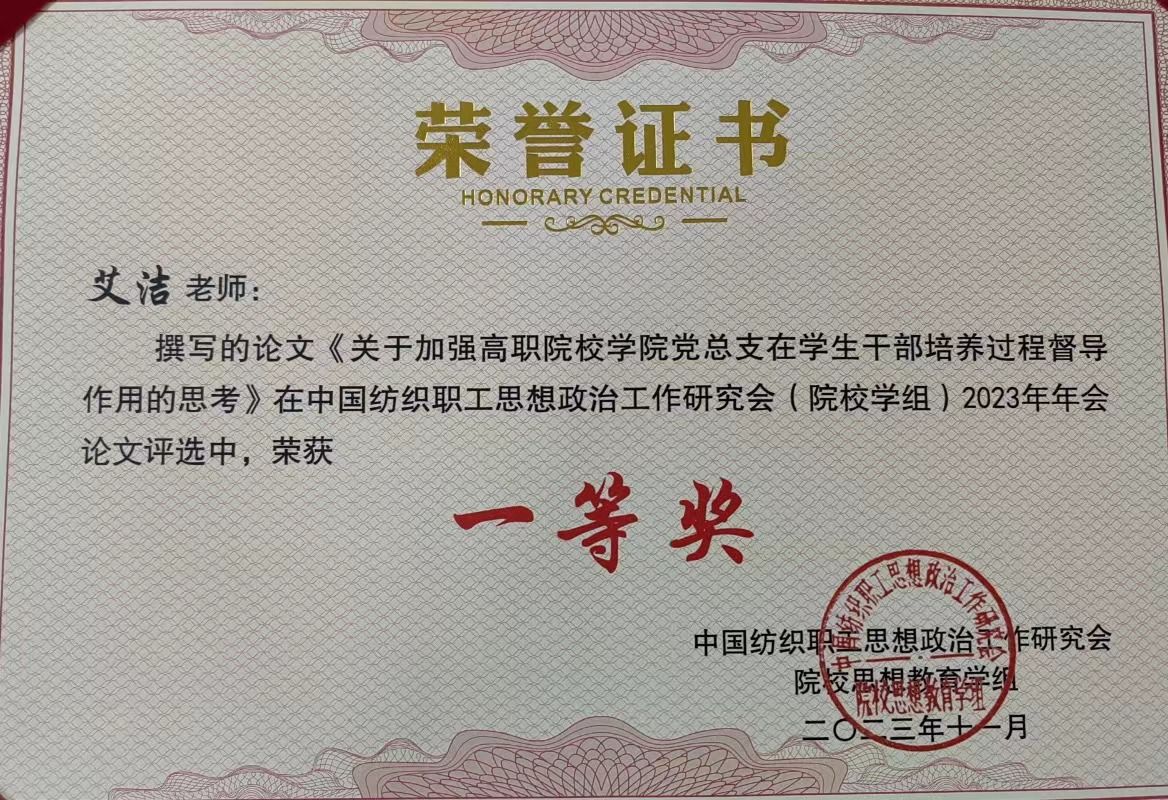 12月19日,智能制造与装备学院专职辅导员艾洁老师撰写的论文《关于加强高职院校学院党总支在学生干部培养过程督导作用的思考》,在2023年中国纺织职工思想政治工作研究会(院校学组)年会论文评选中荣获“一等奖”。