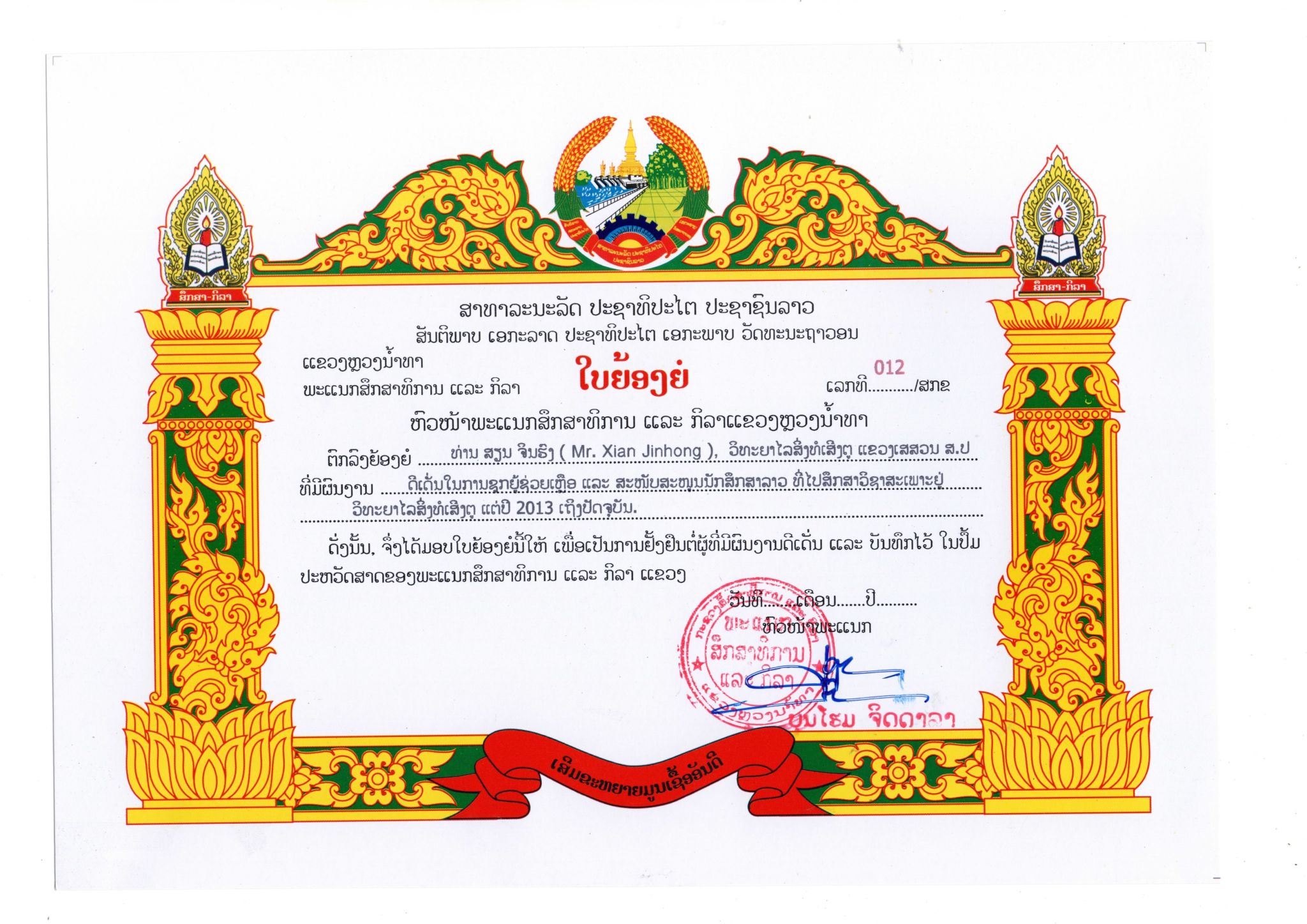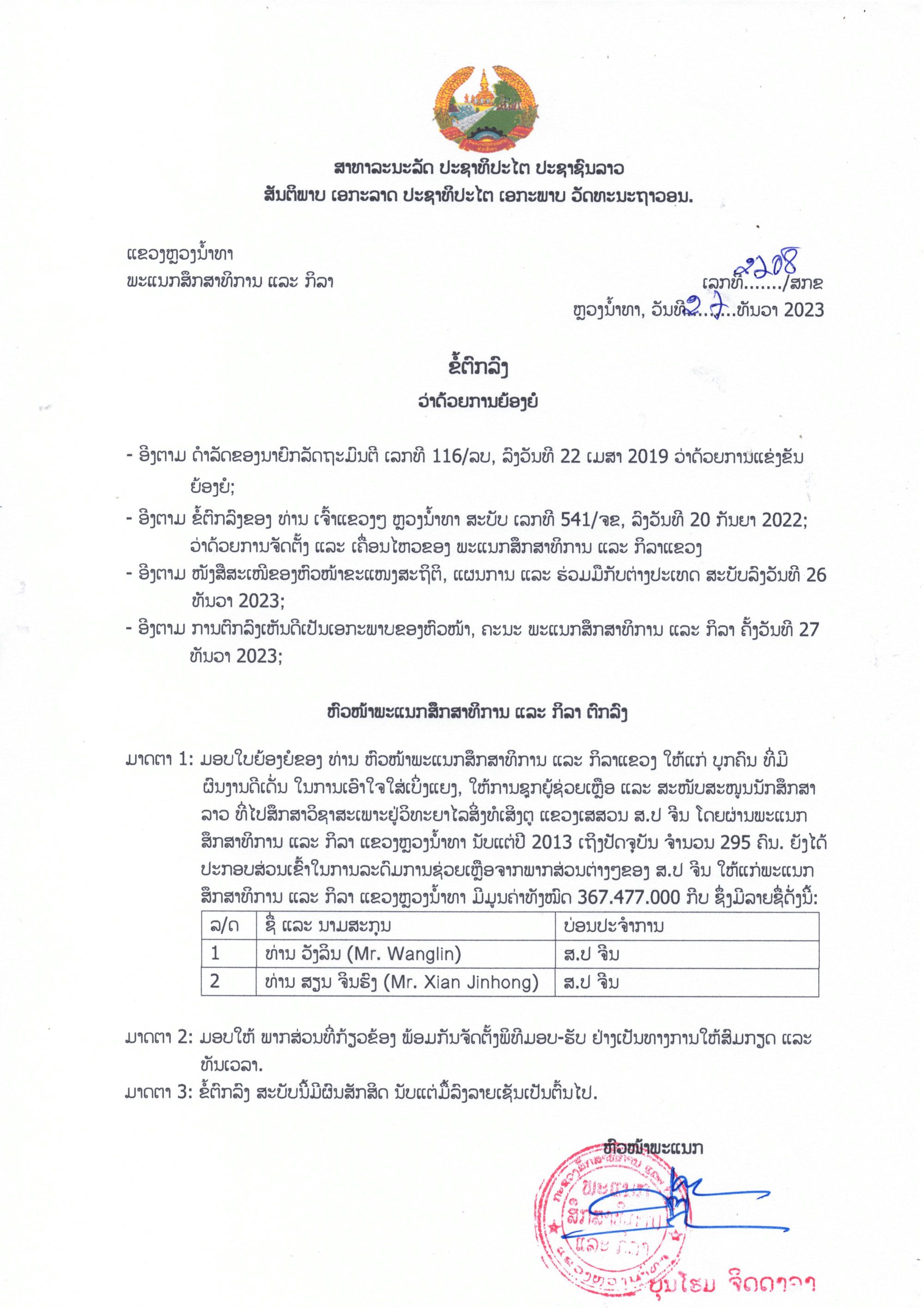 pg电子教师王霖、鲜金宏荣获老挝琅南塔省教育与体育厅“突出贡献”荣誉表彰