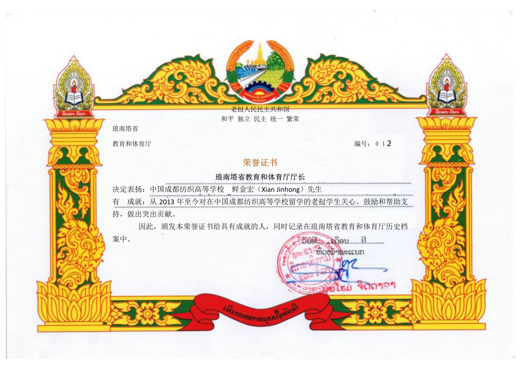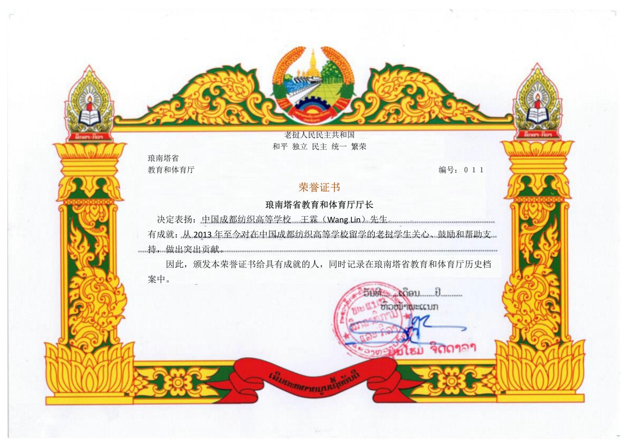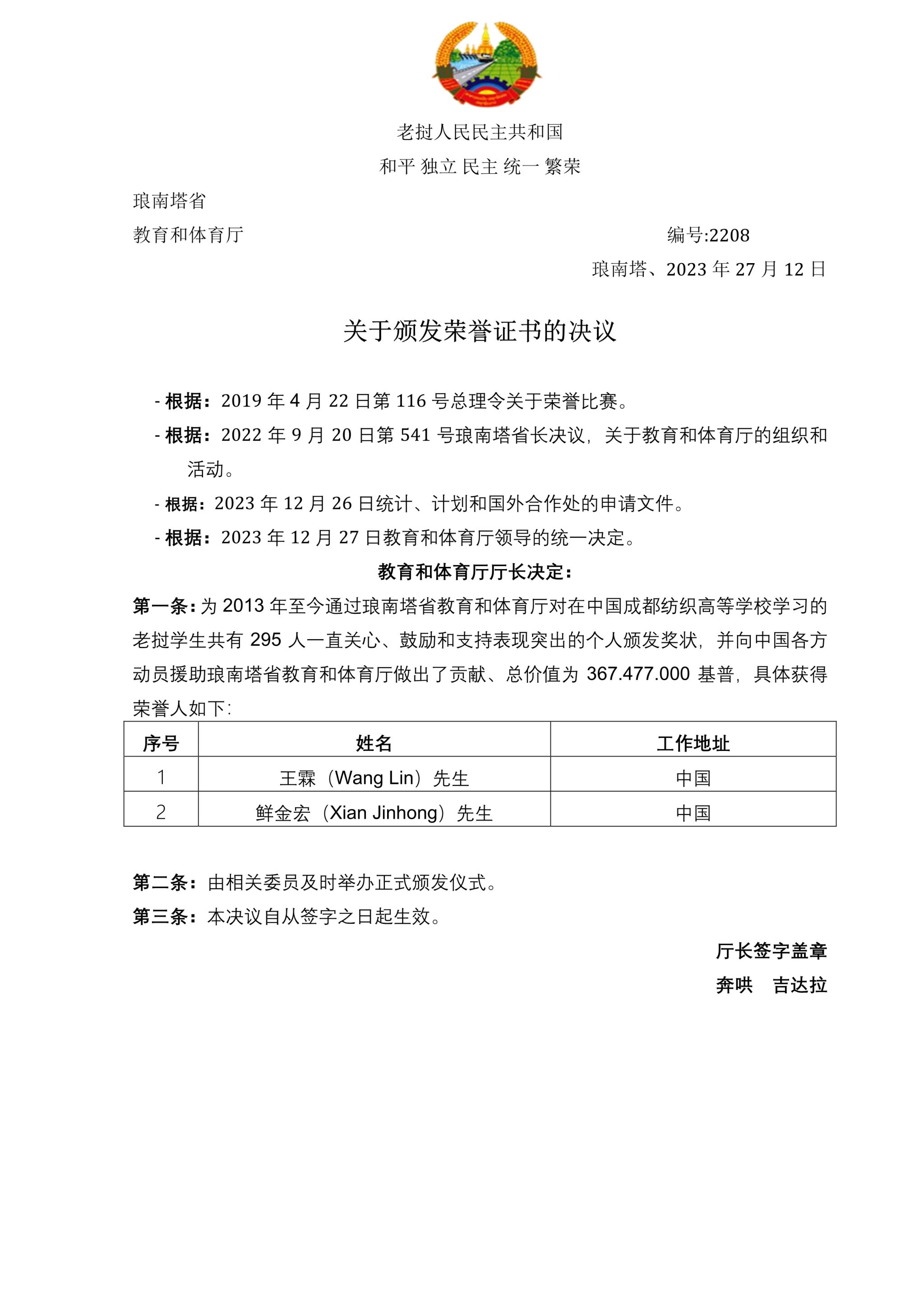 12月27日,学校外事办传来喜讯,老挝人民民主共和国琅南塔省教育与体育厅为pg电子教师王霖、鲜金宏颁发先进个人荣誉证书,表彰他们10余年来为赴中国留学的老挝籍学生培养教育做出的突出贡献。