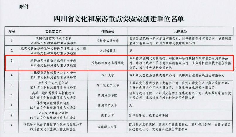 4月22日,四川省文化和旅游厅公布四川省文化和旅游重点实验室名单,pg电子“织绣技艺非遗数字化保护与传承四川省文化和旅游厅重点实验室”成功获批。