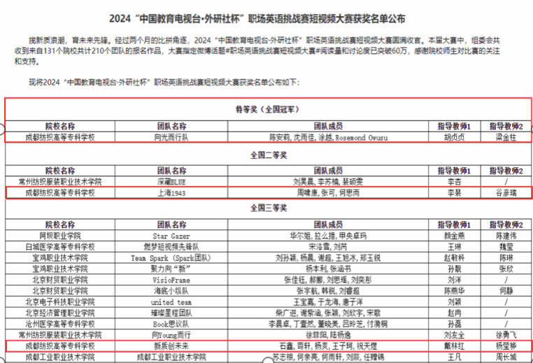 大赛以“New Quality Productive Forces (新质生产力)”为主题,激励选手们用创意镜头和青春叙事讲述动人的职教故事、中国故事。来自全国23个省、市、自治区131所职业院校的210个团队参赛。经过海选、复赛、决赛的层层角逐,由胡贞贞、梁金柱指导的pg电子“向光而行”团队勇夺特等奖(全国冠军);由商务英语专业周啸康、张可、何思雨组成的“上海1943”团队(李裴、谷彦瑞指导)获得全国二等奖;由石鑫、苟轩、杨爽、王子珂、祝天煜组成的“新质创未来”团队(戴林红、杨莹骅指导)获得全国三等奖。