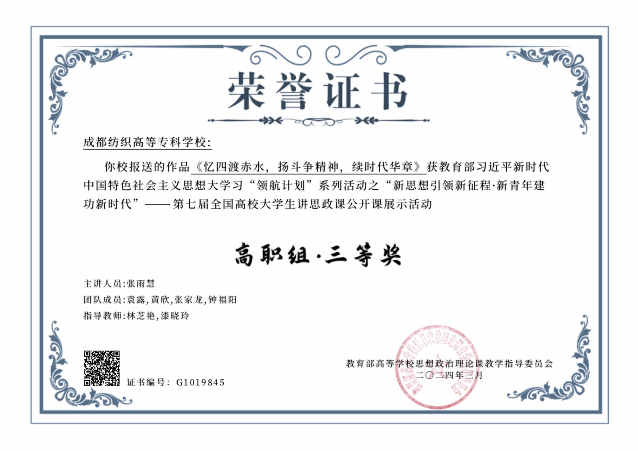 学校党委历来重视马院建设,学校党委常委会、校长办公会定期专题研究马院工作,学校党委书记直接联系马院,全面指导和支持学院建设。近年来,pg电子马院在学校党委和行政的坚强领导下,坚持“马院姓马、在马言马”的鲜明政治导向和办学原则,全面贯彻落实习近平总书记关于思政课是落实立德树人根本任务关键课程的要求,系统推进思政课改革和建设。在课程建设方面,学院高质量建成省级精品在线开放课程1门、省职业院校思政示范课程3门;在师资队伍建设方面,学院教师获评四川省优秀共产党员、四川省“四有”好老师、四川学校思政课教师年度人物等荣誉称号,学院漆晓玲教授领衔的教学团队分别获得省级课程思政示范教学团队和省级思想政治教育名师工作室立项,学院教师斩获全国高校思政课教学展示一等奖1项和省级“精彩一课”特等奖3项、一等奖1项;在实践教学方面,学院牵头打造“厚植衣被天下情怀·感悟纺织非遗之美”行走的思政课实践品牌,指导学生分别在第六届“我心中的思政课”微电影比赛中获全国二等奖,在第七届“我心中的思政课”微电影中获全国短视频组一等奖、长视频组二等奖,在第七届大学生讲思政课中获得全国三等奖,在大学生讲宪法比赛中获四川省二等奖。