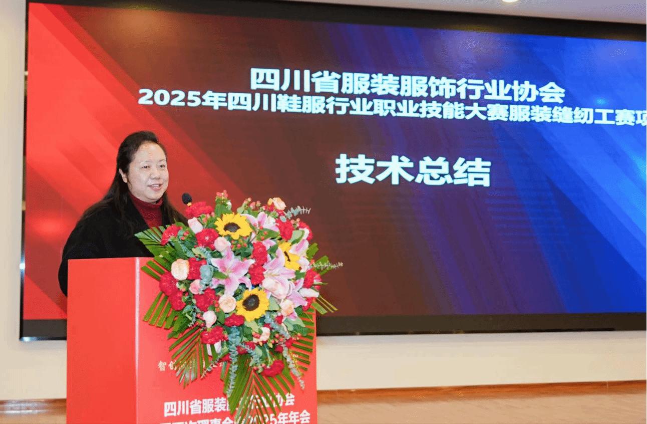 服装产业升级,离不开技能人才的支撑。会上,服装学院阳川教授作为2025年四川鞋服行业职业技能大赛服装缝纫工赛项裁判长,对赛事进行专业点评,指出大赛为行业搭建起高水平的技能竞技与人才选拔平台,有力推动了产业技能根基的筑牢与升级。